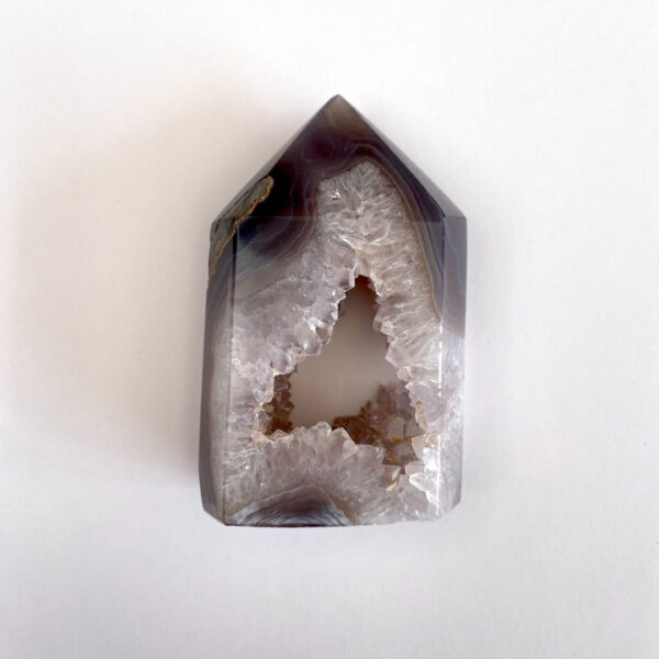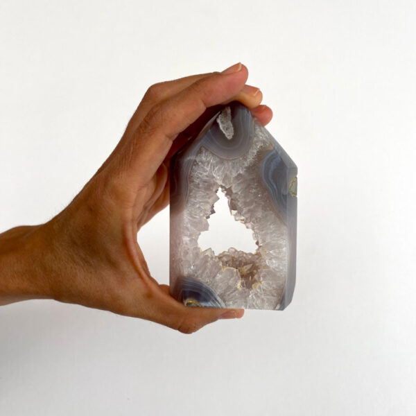 Las ágatas tienen líneas haciendo una especie de círculos. Estas vetas ayudan a purificar los canales de energía de tu cuerpo y de tu entorno. Al ser una geoda tiene una fuerza energética constante en su interior que se irradia hacia lo que allí se sitúe y esta pieza en particular tiene proyección de esa energía por los dos costados, así que puedes aprovechar esta energía disponible para ti, para los que te rodean y para tus espacios.